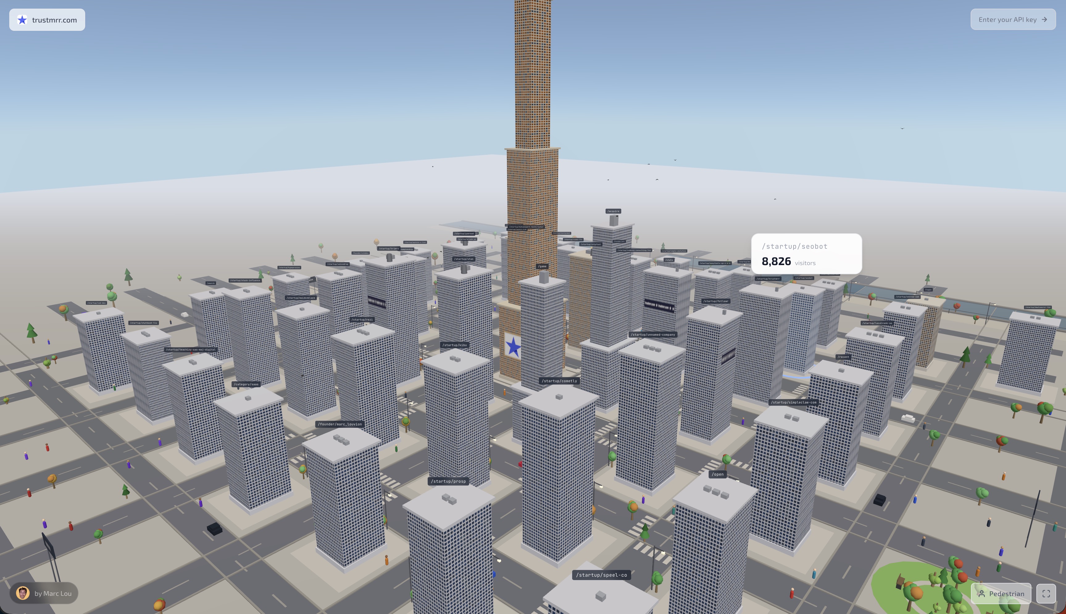 Your analytics as a 3D city. Every page on your site becomes a building — the more visitors a page gets, the taller its skyscraper. Walk through your data.