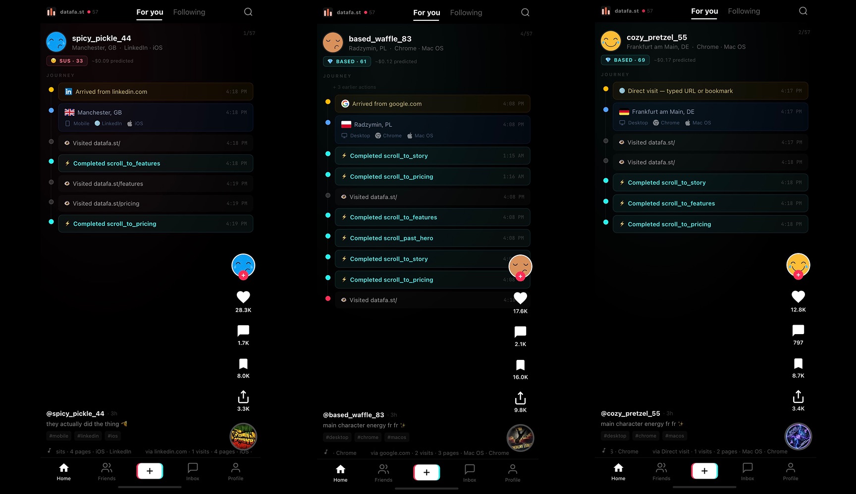 Web analytics, but make it TikTok. DataRot lets you doomscroll through your website visitors in a feed-style interface. Each visitor is a card you swipe through in real time.