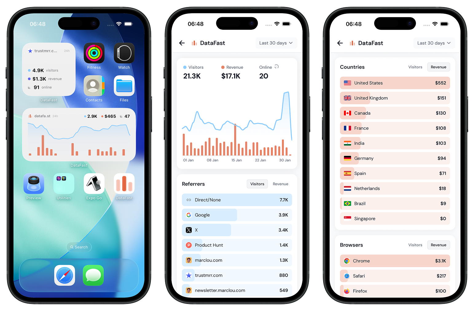 View all your analytics from anywhere with the DataFast mobile app. Available on iOS and Android.